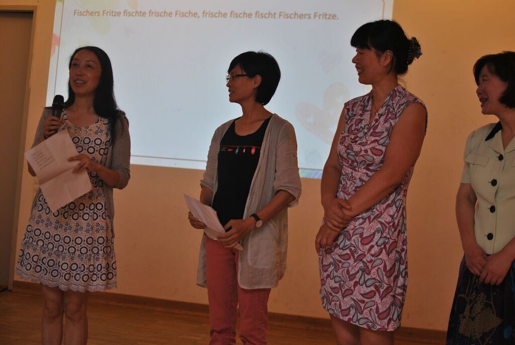 Lehrer und Schüler des chinesischsprachigen Deutschunterrichts führten Zungenbrecher für deutsche und chinesische Dialekte vor.