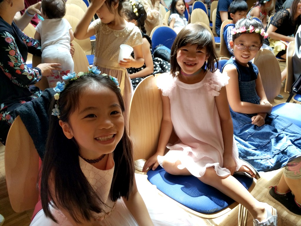 Die Mütter und Lehrerin der kleinen erste Sprachklasse Kinder setzten den hübsch gekleideten Mädchen eine bunte Kopfbedeckung auf, sodaß sie alle wie eine Blummenfee aussahen.