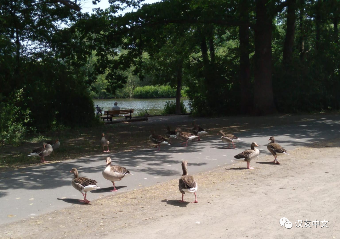 出了动物公园的西门,同学们来到了比邻的Hermann-Löns-Park,去与学校低年级组的同学们汇合。这个以德国下萨克森特点设计的公园建于1938年,整个公园由树林、草地和两个湖泊构成,放眼望去,一派田园好风光。这里栖息的鸟类种类繁多,主要有灰雁、芦苇莺和凤头鹦鹉,堪称鸟的天堂。